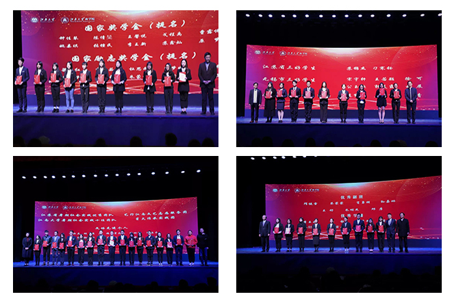 在颁奖环节,出席活动的领导和嘉宾为10名国家奖学金、国家励志奖学金获得者、9名省市三好学生、校三好学生标兵、15名优秀社会实践团队代表、文体先进个人代表、省市优秀学生干部、省市先进集体、校先进集体标兵、优秀副班主任、优秀学业辅导员、远翔奖学金获得者和学科竞赛获奖团队及个人颁奖。