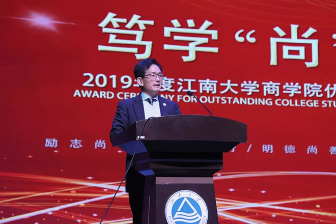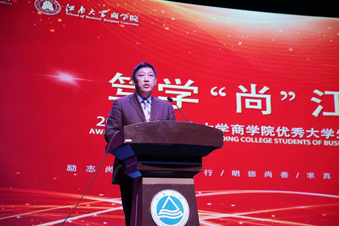 活动尾声,江南大学商学院院长、加拿大圭尔夫大学终身正教授滕乐法发表了热情洋溢的讲话,对优秀学生的精彩分享进行了点评。他指出,荣誉是最好的褒奖,举办优秀学生颁奖典礼,是对教育部“四个回归”要求的落实,是一堂富有教育意义的创新思政课程。滕院长对全体商院学子提出了三点期望:第一,要坚定信仰,坚守初心,做新时代的有志青年;第二,要勤学笃实、脚踏实地,做新时代的有为青年;第三,要明辨多思,崇善修德,做新时代的有德青年。滕院长勉励同学们勇于拼搏、砥砺前行,用奋斗书写青春的精彩篇章,用汗水铸就人生的成功品牌。