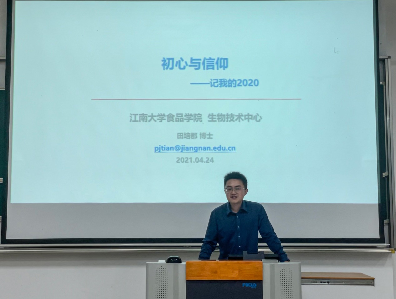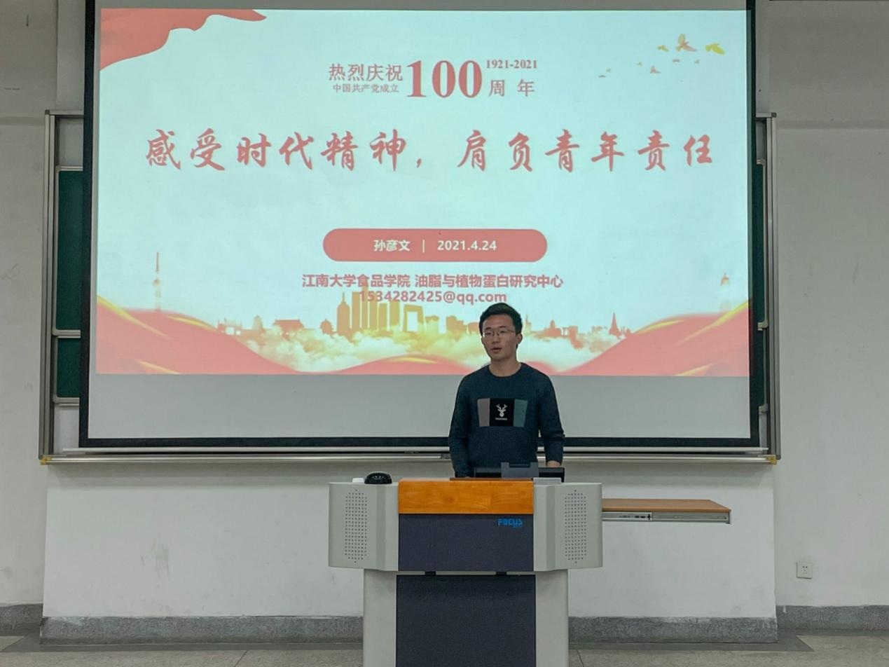 在中国共产党成立100周年之际,为进一步深化学生对党的性质宗旨的认识,提高学生的思想政治觉悟,4月24日晚,食品学院在教学楼2A127举办了“喜迎建党百年,分享初心故事”主题活动。食品学院生物技术中心博士后田培郡、食硕2005党支部书记孙彦文受邀担任主讲,食品学院2020级全体本科生参加了本次活动。