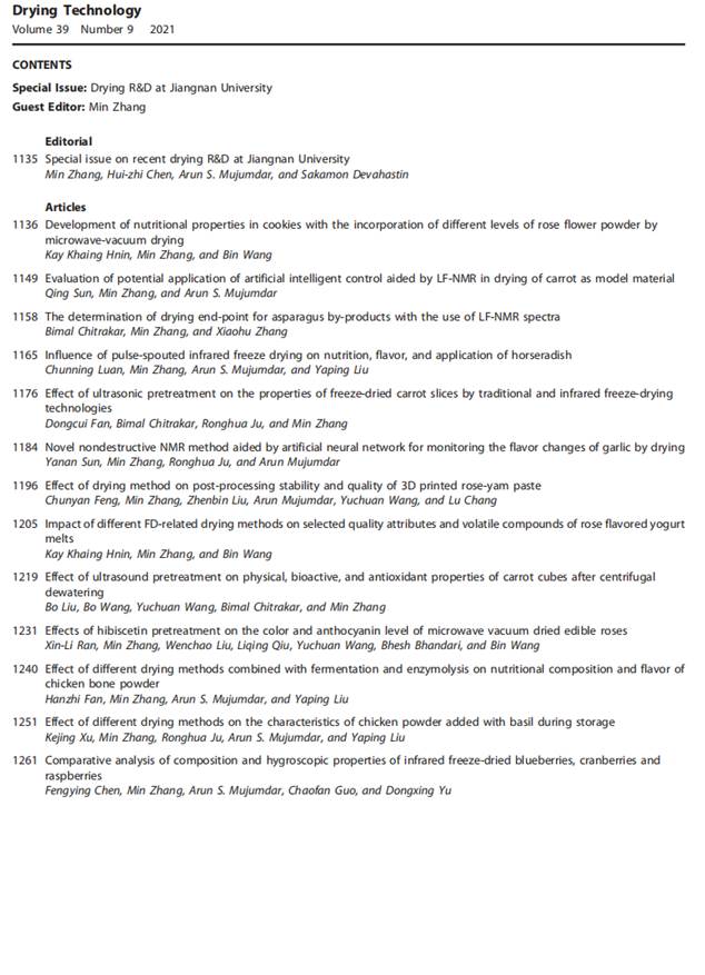 近日,国际干燥领域权威SCI刊物Drying Technology(最新影响因子IF 4.452)时隔七年再次为我校食品学院张慜教授团队出版研究特刊(SPECIAL ISSUE)(2021年第39卷第9期,1135-1270页)。此次特刊以“江南大学干燥研发(Drying R&D at Jiangnan University)”为主题,表彰该团队近年来对食品干燥技术的研发、产业化以及国际干燥领域交流等方面作出的杰出贡献。此期特刊收录13篇食品干燥研究论文,共136页,均来自张慜教授团队。