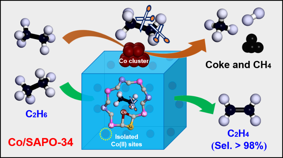 有效抑制低碳烷烃中C-C键的断裂,而选择性地活化C-H键是获得高的目标产物烯烃选择性和高的催化剂稳定性的关键。我校化工学院刘小浩教授团队基于C-H键可控活化机制的深刻认识和理解(Chem. Commun., 2020, 56, 4396-4399;J. Catal., 2020, 387, 102-118;J. Catal., 2021, 396, 224-241),设计合成了SAPO-34分子筛内孔道中孤立稳定的Co(II)活性中心(-AlF-O-Co(II)-O-AlF-)(如图1所示),并将该Co/SAPO-34催化剂用于催化乙烷无氧脱氢制乙烯的反应。实验、表征及DFT计算结果表明:合成的孤立单位点Co(II)物种能够在反应气氛中稳定存在,具有与传统贵金属铂基催化剂可比较的催化活性(TOF);与金属态Co cluster相比较,其能够有效抑制烷烃分子中C-C键的断裂以及C-H键活化,避免生成甲烷副产物和积碳失活,从而获得了高于98%的乙烯选择性,且100 h循环催化评价试验表明催化剂具有优异的稳定性(如图2所示)。此外,实验和计算结果也证实限域在分子筛孔道内表面的钴物种与孔道外的Co cluster相比较,具有更低的C-C键和C-H键活化能力,有利于实现低碳烷烃可控脱氢制烯烃。该项研究工作为构建新型高效的低碳烷烃无氧脱氢催化剂提供了思路和重要理论基础。