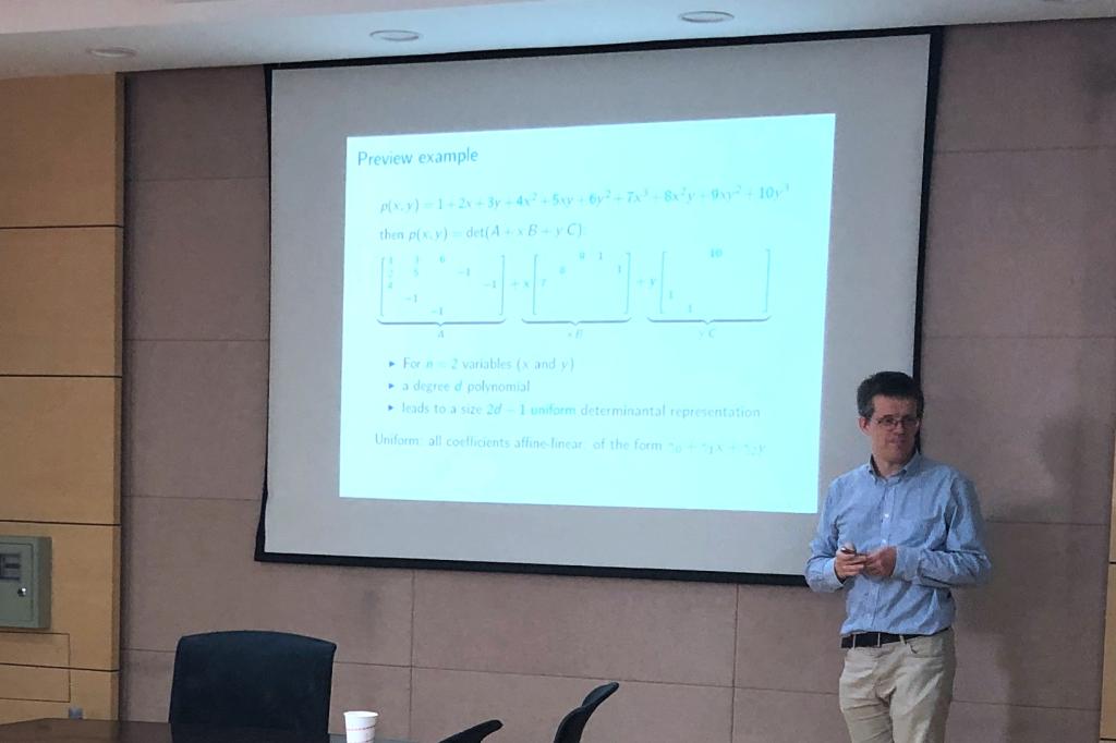 上午10点,Hochstenbach教授作了题为“行列式表示法求解多项式系统问题”的学术报告,数学专业教师以及研究生出席了报告会。报告中Hochstenbach教授首先介绍了多项式的零解和友矩阵特征值之间的关系,接着介绍了一元多项式方程用行列式表示法求解的方法,以及如何合理的用行列式表示法求解二元多项式方程的根,并分析了该方法的优缺点及应用。报告中,Hochstenbach教授还与师生们用中英文进行互动,现场气氛热烈。报告由浅入深,使得在场的师生们收获良多。