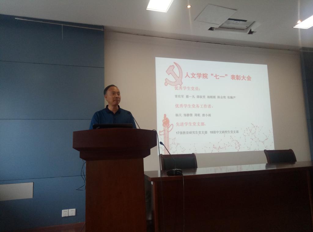接着,沈贵鹏宣读了《人文学院关于表彰2018-2019学年优秀学生党员、优秀学生党务工作者、先进学生党支部的决定》。经过层层选拔与考核,常伦军等六位同学被授予“优秀学生党员”,杨天等四位同学被授予“优秀学生党务工作者”。17级教育研究生党支部和18级中文研究生党支部被授予“先进学生党支部”。范增良、吴宝锁、沈贵鹏分别为优秀学生党员、优秀学生党务工作者、先进学生党支部颁发了荣誉证书。