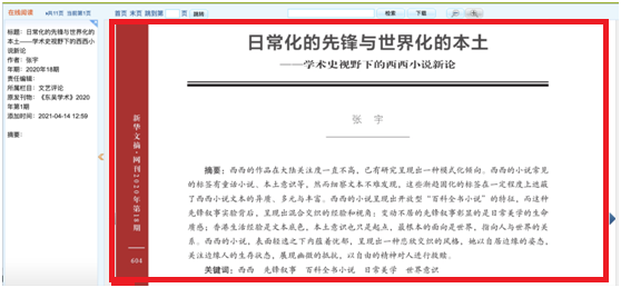 此篇论文首发于《东吴学术》(2020年第1期),作者张宇老师选取学术史视角来探讨香港作家的写作,将其纳入中国当代文学的研究领域,以日常化、世界化这一极富张力的表述打破了当下对于西西创作研究的模式化倾向,因此是一篇富有创见的优秀学术论文。《新华文摘》全文转载是对此文价值的肯定。