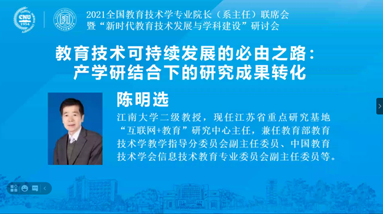 此次会议由教育部教育技术教学指导分委会主办,首都师范大学承办。因受疫情的影响,此次会议在线举行。会议包括6场特邀报告和5个分论坛24场分论坛报告。陈明选教授的特邀报告《教育技术可持续发展的必有之路:产学研结合下的科研成果转化》吸引了全国一万多人参与,并得到与会专家的一致好评。