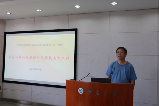 为深入学习宣传贯彻党的教育方针,9月30日下午,人文学院党委在田家炳楼506会议室召开党委理论学习中心组专题学习(扩大)会议,就全面加强和改进新时代学校美育工作进行了专题学习。人文学院党委理论学习中心组成员,江南大学国家大学生文化素质教育基地成员,音乐系、舞蹈系、中文系师生党支部书记及部分教师参加了会议。
