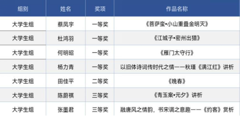 “迦陵杯·诗教中国”诗词讲解大赛从2019年起举办,由教育部、国家语委主办,南开大学和高等教育出版社承办。它是近年来唯一面向大中小学教师以及大学生群体的、以古典诗词讲解教学为主要内容的国家级赛事,也是“中华经典诵读工程”的重要组成部分。本次比赛共收到来自全国23个省市自治区的参赛作品近6万件,经知识测试与专家评审,大学生组共评选出获奖作品250件,其中一等奖20件,二等奖30件,三等奖50件,优秀奖150件。