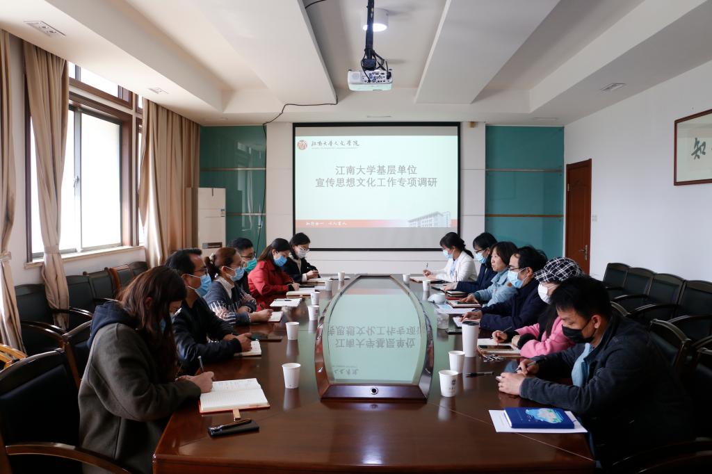姚剑英代表学院对前来调研的宣传部一行表示欢迎,并介绍了学院新闻宣传及思想文化建设方面的工作机制、管理运行和取得成效。姚剑英表示,作为学校首批“三全育人”综合改革示范创建单位,学院终坚持以习近平新时代中国特色社会主义思想为引领,贯彻落实全国教育大会和全国高校思想政治工作会议部署要求,立足学校改革发展大局,不忘初心、牢记使命,把“十全育人”贯穿学院整体工作中,立足学院学科特色,以“党建+师德养成”“党建+传统文化”“党建+文艺”“党建+融媒体”等工作品牌为引领,开展了一系列工作,取得了良好的教育和实践效果。杨晖表示,党委宣传部和人文学院在宣传思想文化工作方面具有紧密的关系、天然的联系,在大学生文化素质教育、融媒体宣传矩阵构建、文艺活动开展等方面取得了良好的合作基础和成效,希望双方能继续发挥各自优势,寻找工作结合点、衍射点、创新点,推进在学校文化普及、美育教育、高雅艺术创作等方面的深入合作,更好肩负起人才培养、社会服务、文化传承创新等方面的使命。人文学院与会领导老师还分别就宣传阵地管理、融媒体中心建设、网络舆情的研判与应对、“形势与政策”课程建设等问题作了汇报交流。