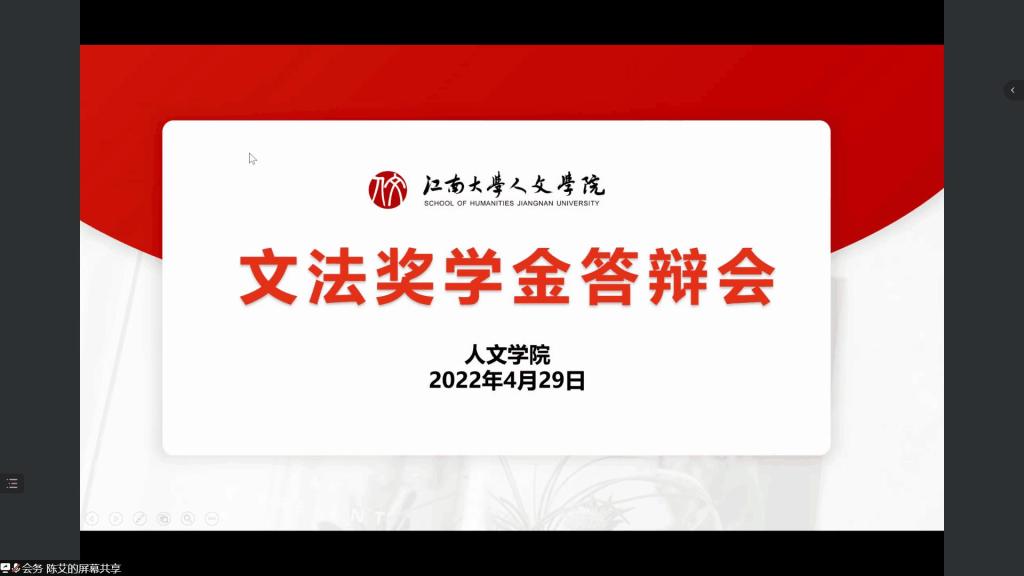 4月29日下午,人文学院文法奖学金答辩会于线上举行。人文学院党委副书记、副院长李萍,副院长于书娟,副教授黄艳萍、舒航,分团委书记赵丽敏及灵山慈善基金会陈睿等出席答辩会并担任评委。