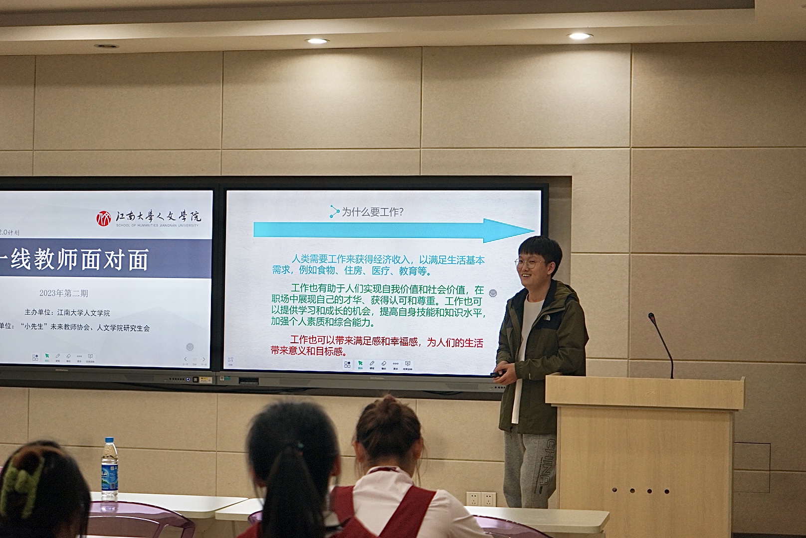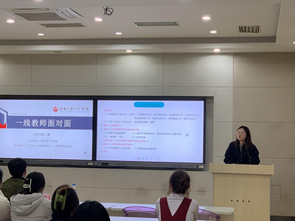 3月12日,人文学院“一线教师面对面”第二场交流分享会在田家炳楼517室顺利举行。本次活动邀请无锡市侨谊实验中学语文教师陈悦悦和无锡市辅成实验学校信息技术教师曾祥攀两位校友围绕青年教师成长开展专题分享。人文学院辅导员李婉婷及50余位学生参加本次活动。活动由“小先生”未来教师协会与人文学院研究会共同承办。