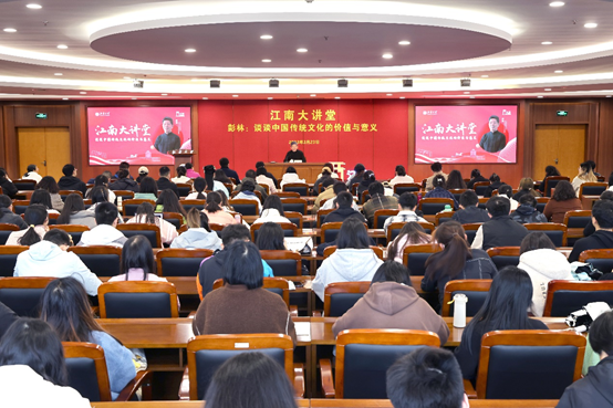 报告伊始,彭林教授从钱穆、刘家和两位先生在江南大学的工作、求学经历谈起,谈到了他们对自己治学与人生的影响,表达了自己在江南大学这所家乡大学、在两位先生工作、学习过的地方开讲的激动心情。随后,他以雅斯贝斯的“轴心时代论”为切口,指出中华文化是人类“轴心时代”出现的三大文明类型之一,其主题是人的道德成长与社会的和谐发展。接下来,彭林谈古论今、引经据典,从历史典故、历史人物、人生经历等方面,强调知识与文化是不同层次的范畴。中华文化给我们以人格、价值观与社会担当,引领我们从做合格的社会人,成长为优秀的社会人,乃至伟大的社会人。他指出,学习与传承中国传统文化,培养人格高尚、国格鲜明的时代新人,是提升国民素质的需要,也是中华再造辉煌、走向世界的重要前提。他特别勉励在场师生阅读经典、研习思想,以中国优秀传统文化挺起文化自信、文化自觉的脊梁,做自尊、自信的中国人。最后,围绕知行合一的传统、中国传统服饰与礼仪、讲好中国故事、中国优秀传统文化的创造性转化与创新性发展等话题,现场听众与彭林展开了深入的交流互动。