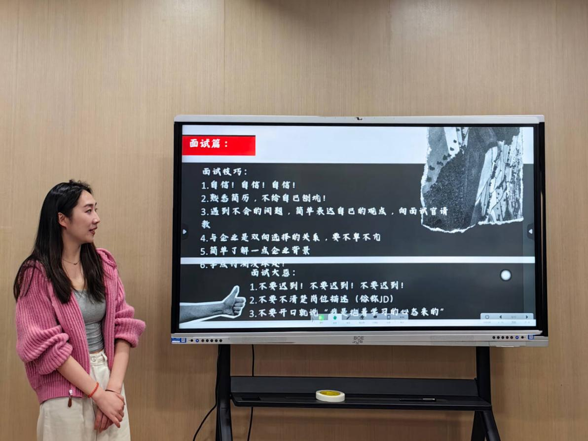 此外,徐丹杨就简历制作和面试准备两方面分享了自己的经验,例如制作简历时,要巧用数据、量化呈现;面试时,要足够自信、提前了解企业背景等,提醒同学们要做好充分的准备。最后,她激励同学们要保有敢于尝试的勇气,抓住每一个机会,成为更好的自己。