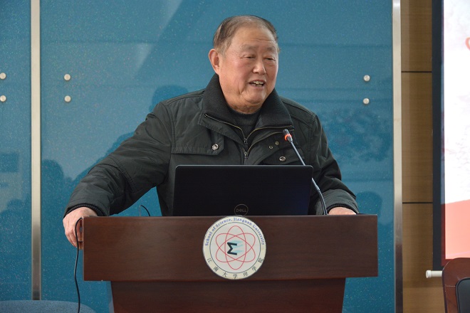 校机关离退休第一支部书记蒋仲华发言。他自谦有幸在迟暮之年可以为理学院的党团共建活动做出一点贡献,希望大家谨记习近平总书记在党的十九大上对青年提出的期望,牢记总书记“青年兴则国家兴,青年强则国家强”的谆谆教导。