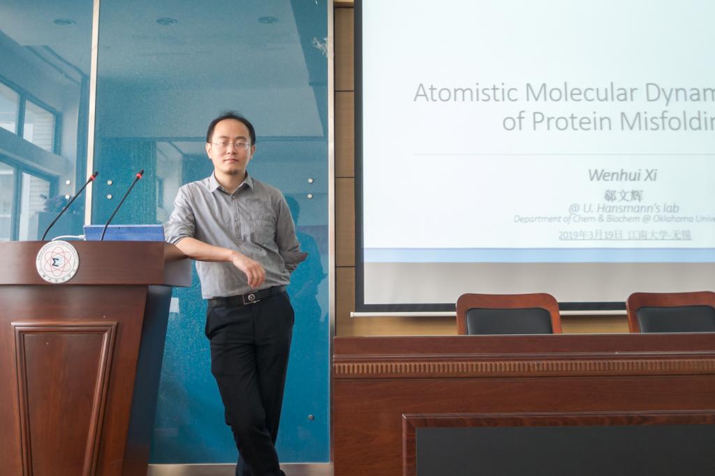 2019年3月21日下午,美国俄克拉荷马大学化学与生物化学系的郗文辉博士应邀访问理学院,并在钱伟长楼202报告厅做了题为《Atomistic Molecular Dynamics Study of Protein Misfolding》的学术报告。报告由王耀来博士主持,理学院和生物工程学院的部分师生参加了本次报告会。