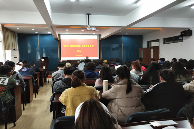 张政委围绕社会主义核心价值观的精神内涵、形成过程、重要性与紧迫性和社会主义核心价值观的培育、践行等内容为同学们作了生动的讲解,紧扣社会主义核心价值观社会层面的“自由、平等、公正、法治”和个人层面的“爱国、敬业、诚信、友善”等内容,采用喜闻乐见的形式巧妙地将古今故事贯穿其中,用一个个鲜活的事例来引导同学们如何认识核心价值观、如何在日常生活中践行核心价值观。他指出,树立家国情怀,是打牢正确价值观的基础。他根据自己积累的经验和丰富的阅历,给学生讲述了抗战时期与抗美援朝的故事,其中让人印象最深刻的就是张老先生讲到自己的岳父,一位参加长征的老红军血洒湘江的故事,讲到动情处,张老先生不禁热泪盈眶,同学们感动不已。张政委当场吟诵他亲自的创作我和我的祖国诗歌,爱国之情溢于言表,让在场师生无比动情,自豪万分。最后,张政委通过一个诚信故事向同学们阐述了一个尊重规则,赢得信任的道理,希望同学们以德树己,做一个有道德的人。