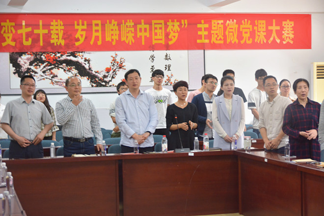 论坛最后,当“我和我的祖国”歌曲响起时,与会全体老师起立,一起高声歌唱,抒发着一名青年教师心中深藏的骄傲和自豪。最后,陈国庆院长宣布应用物理教工党支部为下一届论坛的承办方,并举行了交接仪式。
