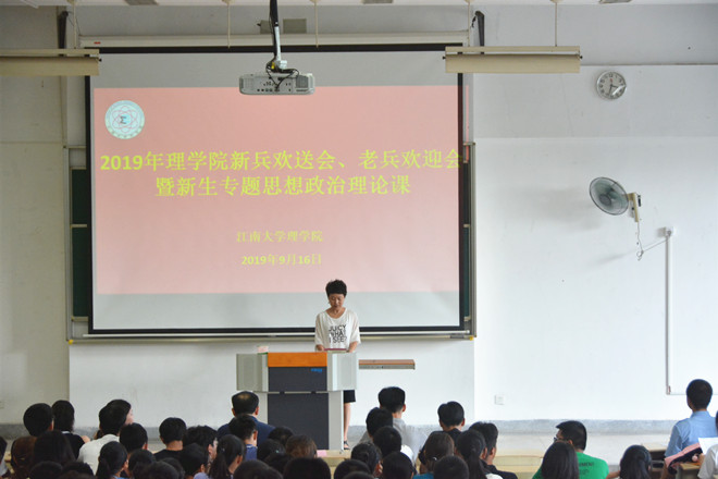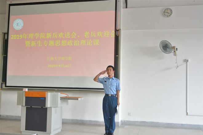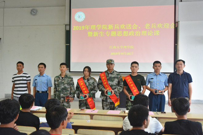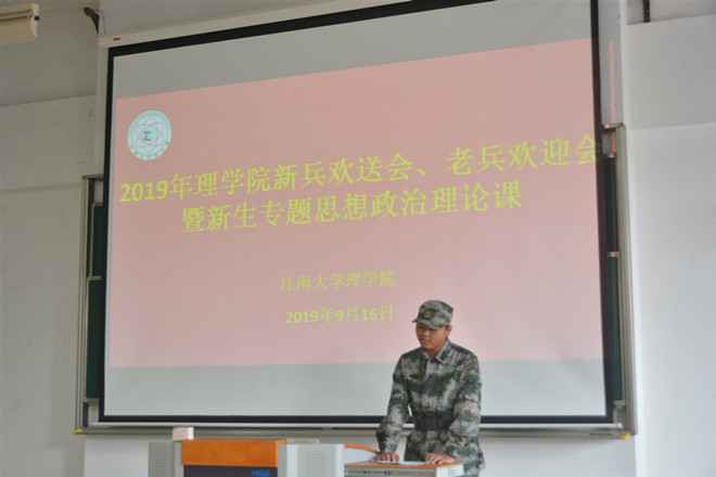 9月16日下午,理学院在2A127召开了2019年新兵欢送会、老兵欢迎会暨2019级新生专题思想政治理论课。院党委书记王珏,院长陈国庆,院党委副书记、副院长陈周,19级预科班辅导员苏丹,18级本科生辅导员曹磊,19级本科生辅导员李丹,5名退伍老兵、3名入伍新兵以及19级全体本科生、预科生参加此次大会。会议由曹磊主持。