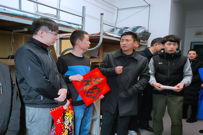 戴月波等一行人来到理学院学生集中安排的鸿苑住宿园区。戴月波亲切问候留校学生,询问他们留在学校生活和学习方面是否适应,生活作息安排是否科学合理,并了解留校研究生的论文和实验的进展情况,安慰他们不要着急,慢慢来,利用好寒假留校时间实现弯道超车。随后,戴月波等人给留校学生送上了新年“旺旺大礼包”,寓意在新的一年,同学们在学习、生活方面继续保持旺盛的热情和活力,更上一层楼。同时,戴月波还给四个宿舍送上春联,这是理学院请宣传部胡奕老师特意为留校同学准备的爱心礼物,在这简单的文字中,体现了学校和学院对留校学生新的一年的美好期盼。王珏提前预祝留校学生度过一个难忘、特殊的新年,祝愿同学们开开心心过大年;陈国庆叮嘱同学们随时随地和学院老师保持联系,有任何困难都随时向学院反映,学院会第一时间回应并积极解决,希望大家在新年里一切顺利。