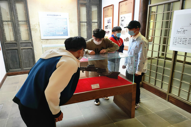 活动伊始,同学们在纪念馆讲解员的带领下参观并浏览了新四军第六师战时历史遗物以及抗战先烈历史语录等书文笔记;聆听并学习了抗战时期真实鲜活的抗日故事和新四军第六师艰辛建立过程,重温了党的光辉历史。讲解员生动地为同学们介绍了新四军第六师部当初定址于此的原因,讲述了新四军战士和锡北人民奋勇抗击日本侵略者的光辉事迹,介绍了新四军的“铁军”精神,在耳濡目染中同学们精神振奋。随后,同学们又观看了关于记录新四军第六师部于锡北抗战历程的纪录片——《民族危亡,华夏同仇》。在视觉听觉的共同冲击下更加深刻地全面地了解了先辈们那一段艰辛的光辉岁月。