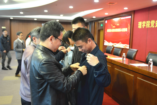 悠扬的校歌声中,新党员入党仪式正式开始。55名新党员依次走到台前,由教师党员为他们佩戴党员徽章。一枚枚小小的党徽,不仅承载着党员教师对学生成长成才的殷切希望,也象征着共产党人坚定信念、初心使命的继承与发扬。之后,会场所有党员一齐起立,举起右手,面对党旗进行了庄严宣誓。