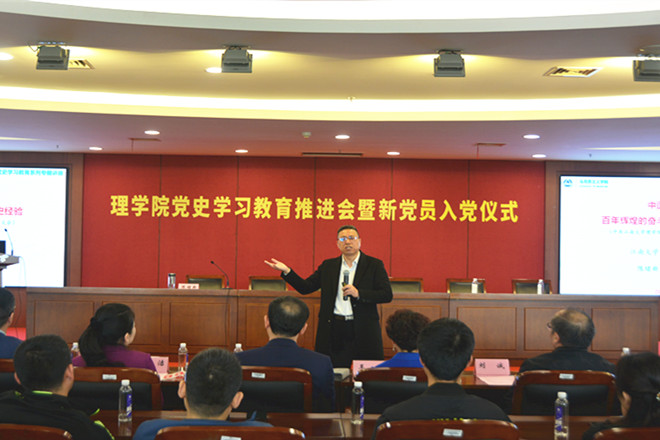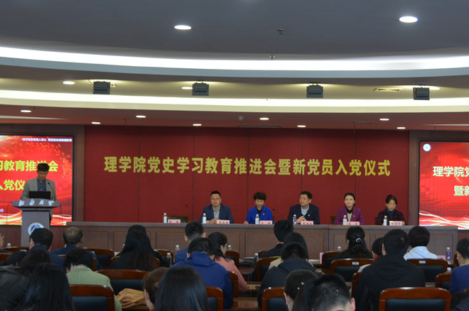 为进一步落实习近平总书记在党史学习教育动员大会上的讲话,全面推进学院党史学习教育做深做实,4月14日,理学院党史学习教育推进会暨新党员入党仪式在图书馆5楼多功能厅举行。理学院全体班子成员、马克思主义学院教授陈绪新及所有师生党员参加会议。会议由理学院党委副书记、副院长陈周主持。