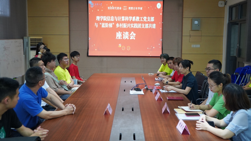 7月9日下午,理学院信计系教工党支部与“蓝阶梯”乡村振兴实践团18、19级信计团支部共20余人在理学院201会议室举行党团共建座谈会,理学院副院长胡满峰和分团委书记许金红应邀出席,信计系教工党支部书记鲁海燕主持会议。