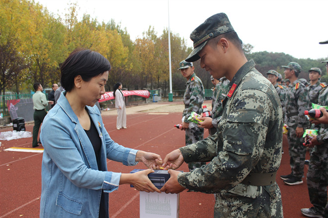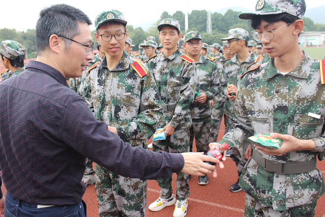 最后,领导们为同学和教官发放了军训慰问品,每一件慰问品都有美好的寓意,表达了学院对新生的关怀与祝福。