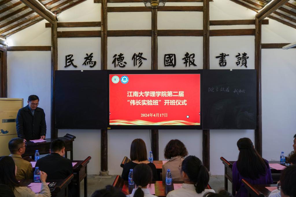 开班仪式在与会人员高唱国歌中拉开帷幕。王珏致开班辞,首先向钱穆·钱伟长故居的大力支持和热情接待表示衷心感谢。她简要介绍了钱伟长老先生的生平事迹和突出贡献,回顾了钱老与江南大学及理学院的不解之缘,指出学院把拔尖人才培养实验班命名为“伟长实验班”,既是对钱老的深切勉怀,也饱含着对学子的殷切期盼。她希望伟长班学子要学习钱老热爱祖国、情系人民的崇高品德和勤于钻研、勇于创新的科学精神,不负时代所托和学院期盼,以实际行动成长为厚基础、重能力、强素质、有情怀的拔尖创新人才,为建设伟大祖国贡献力量。
