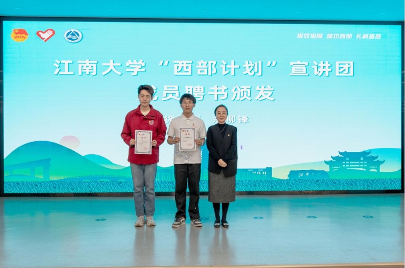 活动现场,单云婷为江南大学西部计划宣讲团成员颁发聘书。互动答疑环节,同学们围绕志愿服务政策细则、个人职业发展规划等关切问题踊跃提问,志愿者成员们结合自身经验与专业知识耐心解答,现场交流氛围热烈,为青年学子明晰志愿服务方向、锚定成长目标提供了有力指引。