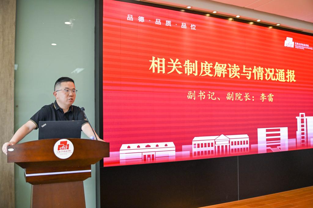 李雷通报近期学校、学院关于安全工作和学风建设的部署和要求,并详细解读最新修订的《食品学院班主任选聘与管理实施细则》以及刚刚启动实施的《食品学院“三查两谈”学风促优行动方案》。