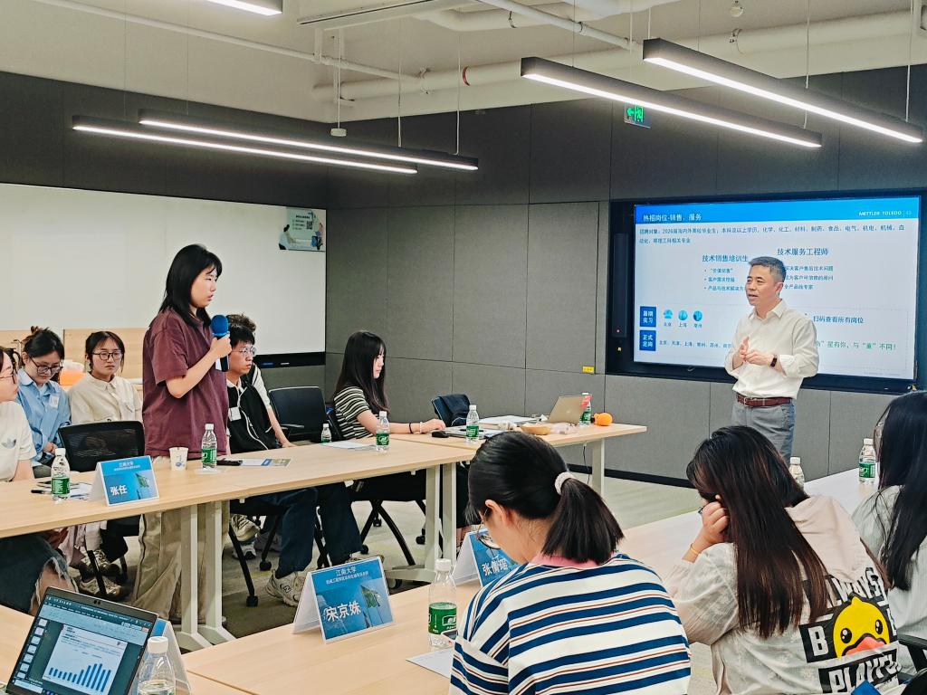梅特勒托利多中国区工业业务苏皖区域销售工程师徐嘉豪、实验室服务运营部技术服务工程师陈春杰先后分享其职业发展和个人成长经历。他们详细介绍日常工作内容、职业发展方向以及工作环境和氛围,强调公司高度重视人才培养体系,并热情欢迎同学们加入。