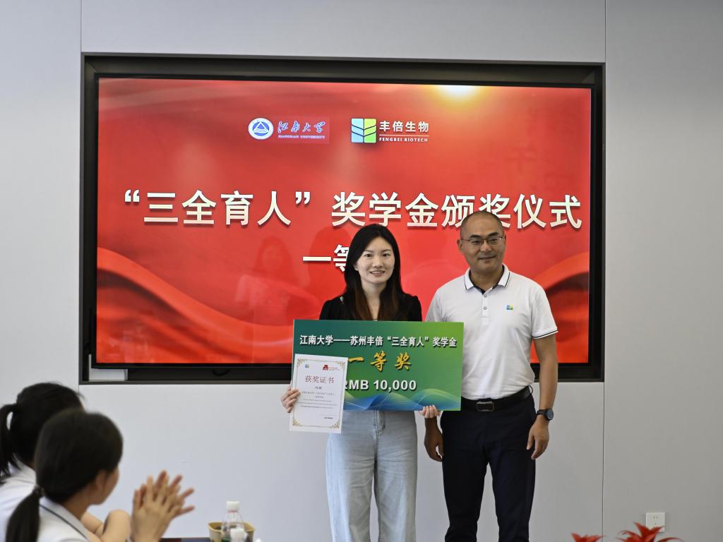 平原、李雷等为荣获第二届苏州丰倍“三全育人”奖学金的本硕博学生代表颁发荣誉证书,并合影留念。李雷向苏州丰倍颁授“江南大学大学生就业最佳战略合作伙伴”铭牌。