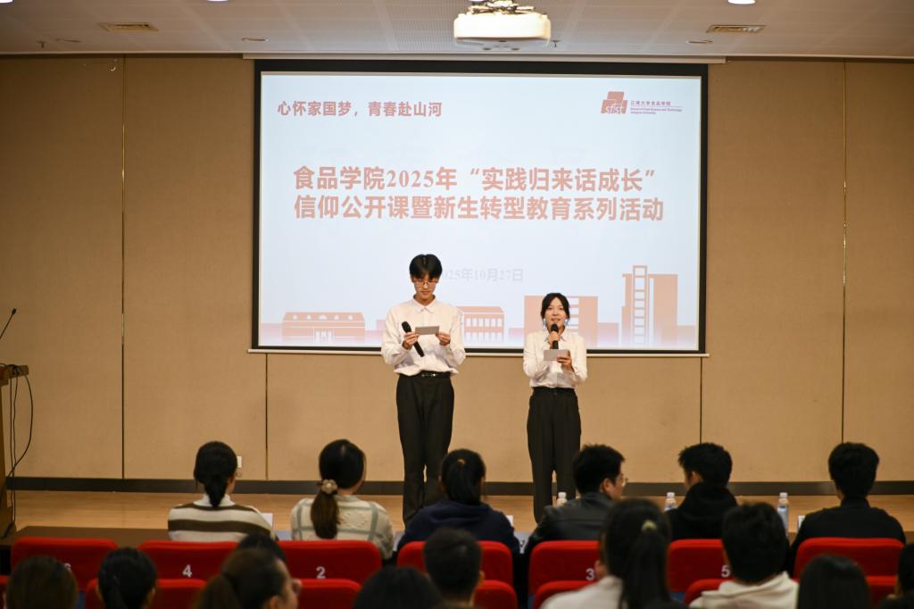 10月27日晚,食品学院2025年“实践归来话成长”信仰公开课暨新生转型教育系列活动在图书馆305报告厅举行,2025级全体本科新生参与其中。