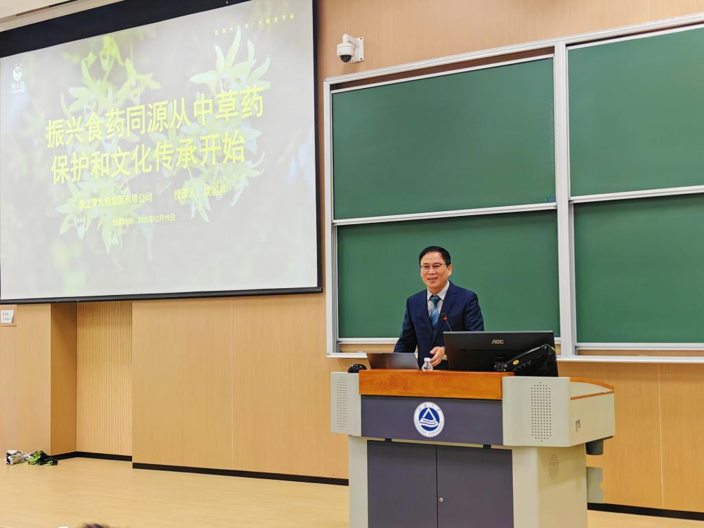 12月19日晚,江南大学食品学院《食品产业导论》系列讲座迎来第五讲。本次课程特邀浙江健九鹤集团有限公司董事长姚国祥先生,为师生带来了一场兼具产业洞察与人文情怀的精彩报告。姚国祥先生不仅是企业家,更担任多项社会职务,是宁波市劳动模范、余姚市社科联副主席,同时也是第七批宁波市非物质文化遗产“余姚铁皮石斛炮制技艺代表”传承人,持续推动铁皮石斛产业发展与文化保护。