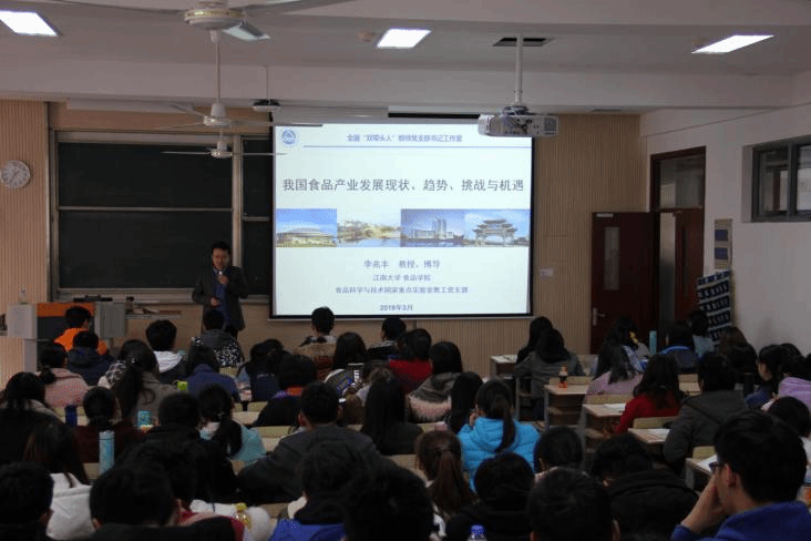 为学习贯彻习近平总书记在学校思想政治理论课教师座谈会讲话精神,探索“课程思政”新形式新路径,推动思政课教学改革创新,3月22日,全国首批“双带头人”教师党支部书记工作室、食品学院国家重点实验室教工党支部书记李兆丰教授应邀走进《马克思主义基本原理》课程教学讲堂,结合马克思主义唯物辩证法中“事物的变化发展”原理,为食品学院18级食品专业本科学生作了主题为《我国食品产业发展现状、趋势、挑战与机遇》专题讲座。李兆丰指出,唯物辩证法是认识世界和改造世界的根本方法,也是我们认识食品产业发展形势的重要工具。以习近平新时代中国特色社会主义思想为指导,牢固树立和贯彻新发展理念,运用辩证的眼光分析我国食品产业发展形势,发现当前我国食品产业表现为“大规模、大格局、大转型和大安全”等基本现状,未来的发展将是“新科技、新布局、新品质、新业态和新竞争”等新趋势。食品产业将面临“忧生态、忧营养和忧安全”等系列挑战,与此同时,城镇化、农业产业化和传统食品工业化的快速发展将会为食品产业发展带来非常大的机遇。我国饮食文化历史悠久,食品工业在世界具有重要地位和影响,食品专业具有广阔的发展前景,对此同学们应该有充分的文化自信和专业自觉,系统把握食品产业未来发展前景,为学好本专业和作好职业规划而努力。