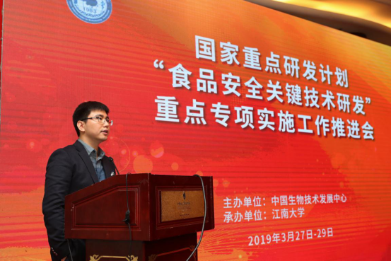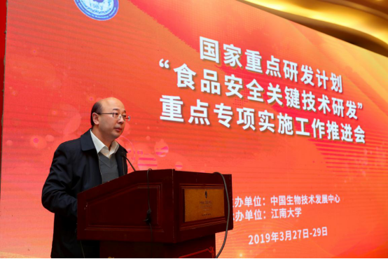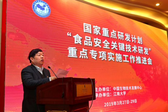 3月28日,由中国生物技术发展中心主办,江南大学承办的国家重点研发计划“食品安全关键技术研发”重点专项实施工作推进会在江苏无锡召开。中国生物技术发展中心副主任范玲,科技部社会发展科技司陈欣,科技部资源配置与管理司张庆梓,国家科技风险开发事业中心副处长刘军,科学技术部科技经费监管服务中心副处长周丽滔,江苏省生产力促进中心主任赵志强,江南大学校长陈坚院士、副校长陈卫教授、科研院院长吴小俊教授、食品学院院长刘元法教授,专项专家组沈建忠院士、吴清平院士、路勇研究员等,2016年、2017年、2018年立项的项目负责人等300余人参加大会。推进会开幕式由中国生物技术发展中心工业生物技术处处长付卫平主持。