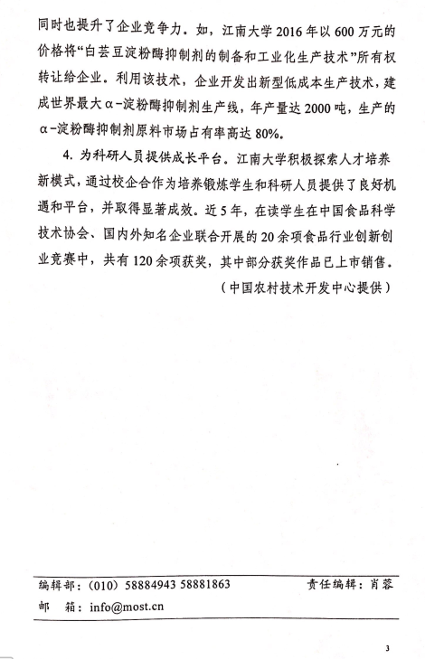 据悉,《科技工作情况》是科技部办公厅主办,面向全国科技管理工作条线发布的学习参考资料。该篇报道自2018年中国农村技术开发中心到访江南大学食品学院调研时获取素材,后经中心整理成稿交由《科技工作情况》刊发。