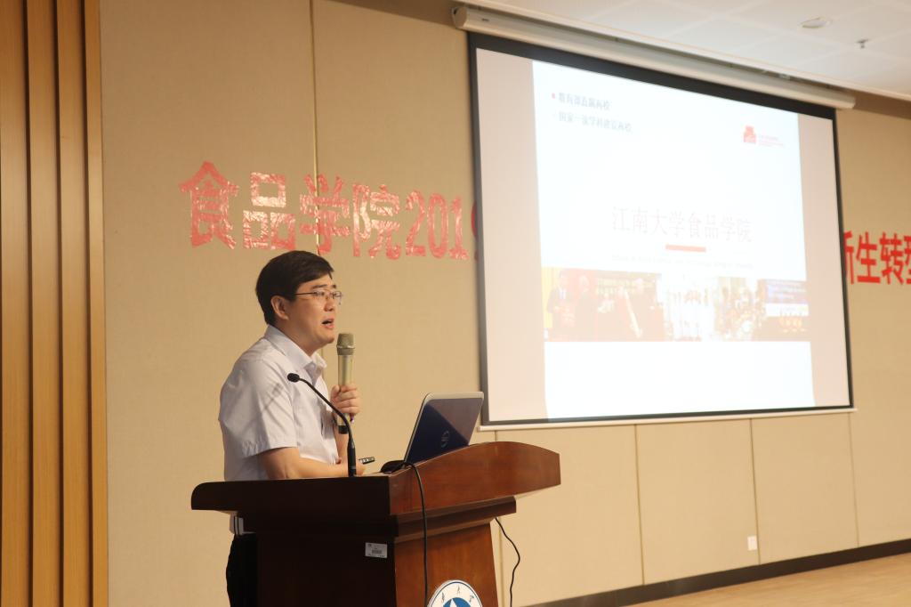 院长刘元法教授向大家介绍学院概况。他围绕着学院历史沿革、学科建设、人才培养、科学研究、社会服务、学院文化、国际交流等方面进行详细的介绍。他通过列举食品学子在科创竞赛中取得的成绩及转化的上市产品,让新生们深刻地感悟到:食品应扎根于生活,同时也反哺生活。他期待着新时代的食品人能够“长江后浪推前浪,一代更比一代强”,致力于以自己所学解决中国食品领域的“卡脖子”的隐忧。