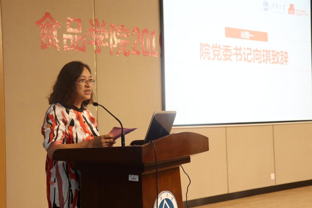 典礼伊始,学院党委书记向琪为开学典礼致辞。首先,向琪对新生的到来表示热烈欢迎和衷心祝贺。她指出,中华人民共和国成立70周年来,取得了举世瞩目的成就,江南大学食品学科的建立与发展便是一个缩影。她希望,新时代的大学生应当忠于祖国,用所学服务国家发展;勤于学业,用勤奋夯实专业基础;善于实践,用行动感悟大学之美。