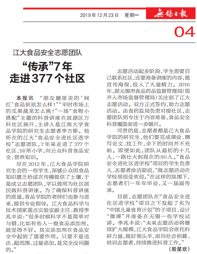 12月23日,无锡日报以《江大食品安全志愿团队“传承”7年走进377个社区》为题,深度报道了该项目创立七年以来的发展历程,志愿者团队历经艰辛,仍不忘初心,砥砺前行,彰显了江南大学食品学院学子们有本领、有担当,为食品安全事业无私奉献的高尚精神品质。