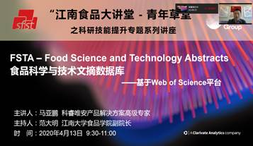 为持续提升青年教师和研究生的基础科研能力,在江南大学信息化建设与管理中心大力支持下,食品学院于4月13日采用企业微信视频直播的方式,成功开办“江南食品大讲堂—青年草堂”之科研技能提升专题系列讲座—FSTA数据库培训。讲座活动由科睿唯安产品解决方案高级专家马亚鹏主讲,食品学院副院长范大明教授主持,食品学院部分青年教师及2017-2019级研究生参加了此次活动。