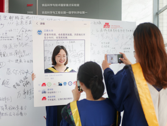 在手持展板拍照区域,食品学院特别定制“朋友圈”和“学生证”两种样式展板供毕业生选择,为毕业生们提供别样的“拍照圣地”。手持展板吸引诸多毕业生们留下属于自己的独家毕业记忆。