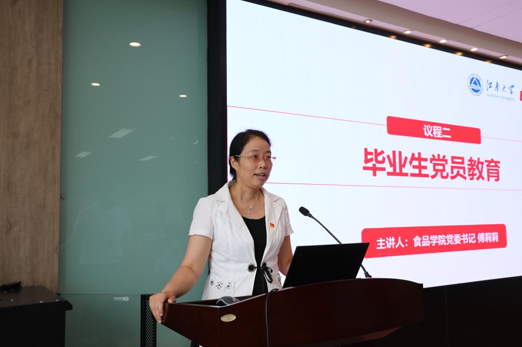 首先,傅莉莉做毕业生党员离校教育。她指出,共产党员是一个光荣的称号,更是一份责任与使命,希望大家始终发挥党员先锋模范带头作用,并提出三点期望。一是不忘初心、牢记使命。希望大家提高政治意识、学会常寻初心、加强思想学习、注重实践积累,永葆共产党人的初心。二是恪守正道,敢于创新。既要遵守党规党纪、法律法规、规章制度,又要恪守专业之道。在此基础上,善于发现勇于创新,将所学服务于国家需要,推动中国食品行业的发展。三是勤勉有为,展现风采。希望大家始终铭记“勤业、创新、争先、共赢”的院训,将在江南大学学到的知识、培养的能力、养成的品格,淋漓尽致地展现出来,以赢得工作单位对于食品学子的认可,让社会各界为江南大学点赞。