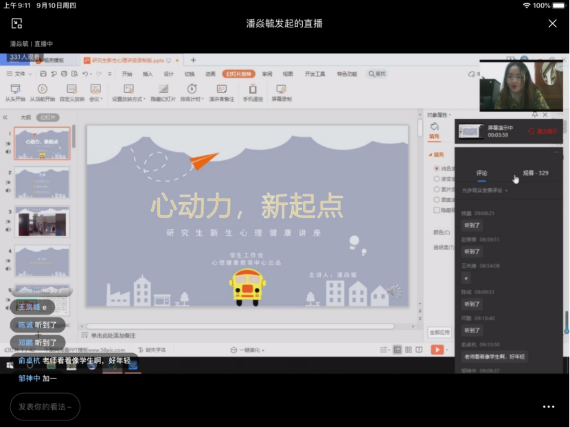 讲座伊始,潘老师首先播放了一个“长达八个月的假期后开学”的采访视频,用幽默的内容舒缓了大家的心情,让同学们进入听讲状态。然后潘老师围绕着学习、人际、生活、就业四个方面,分别做了详细的心理指导说明。她先为同学们打了“预防针”,介绍进入研究生生活后,可能会与遇到学习生活压力增大、社交圈相对封闭单一、奋斗目标遭受挫折等几种常见的问题,再针对这些问题提出了像接纳变化、量力而行,理性分析、挖掘自身优势等方法。随后潘老师引用了《我有一条黑狗》和《狐狸的危机故事》两个例子告诉同学们,遇到问题每个人都会有不同的做法,但是千万不要逃避,要勇敢面对,并且不要因为顾及面子而不去寻求帮助。最后潘老师向现场同学介绍了一些心理知识相关的公众号和学校心理中心的预约方式,建议大家借助互联网了解更多的心理知识,并运用在自身心理调适和日常心理工作中。讲座结束后,在线听讲的同学们就自己的疑问发表了讨论,在直播间与潘老师互动热烈。