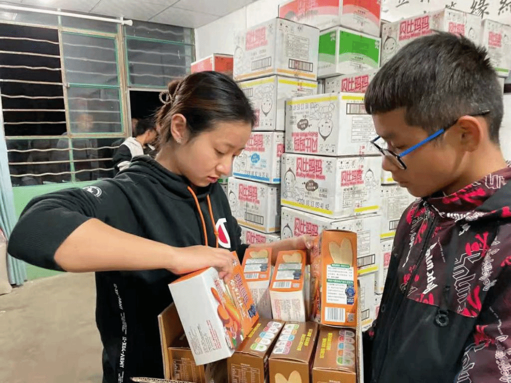 江南大学研支团成员、食品学子鲁晨辉为学生分发礼品