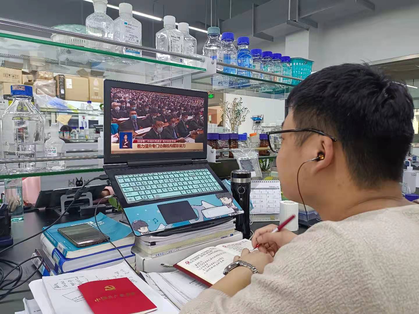 学生在实验室观看会议