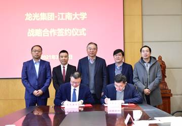 2021年3月11日上午,龙光集团和江南大学战略合作签约仪式在食品学院举行。龙光生鲜食品集团总裁林经熙、招商中心总经理张平、冷链仓储事业部总经理刘富荣,江南大学校长助理张光生、产业技术研究院院长刘龙、食品学院院长刘元法、食品学院副院长程力等参加了签约仪式。