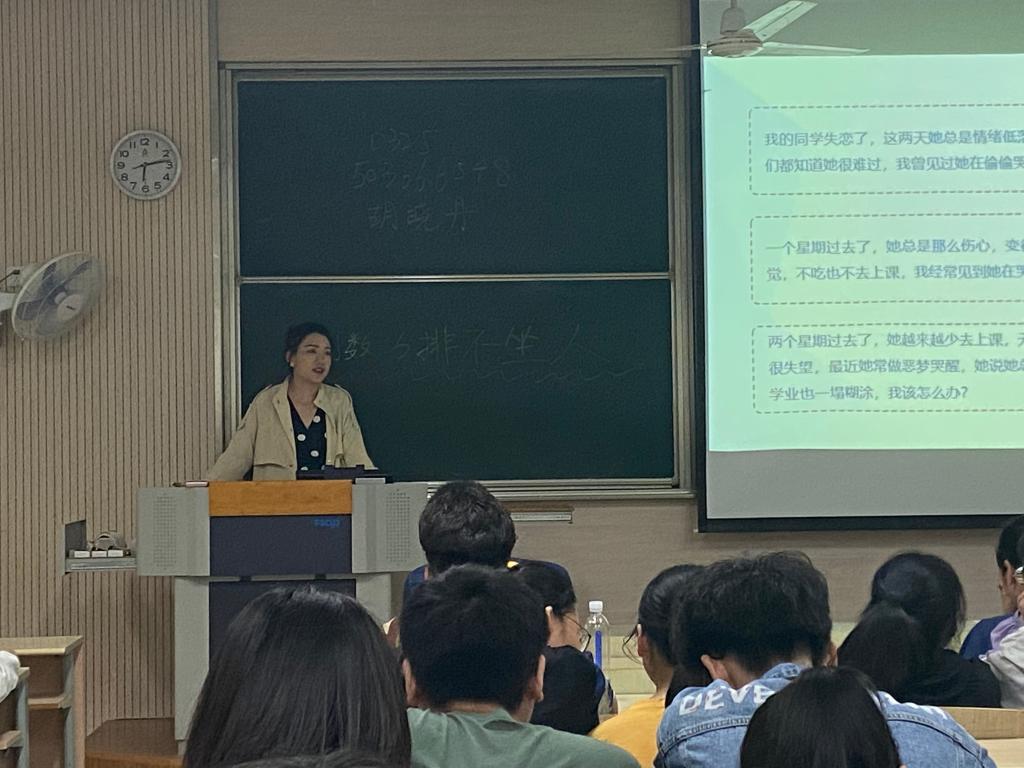 胡晓丹首先阐述了举办此次培训的意义,表达了学校和学院对同学们身心健康状况的关注与重视。接着,胡晓丹就日常宿舍生活中可能出现的一些问题情境,与宿舍长进行现场交流互动,引导同学们思考宿舍长的职责和解决问题的方式方法。胡晓丹通过举例,提示了宿舍长们在学习和生活中需要重点关注的人群,并就同学可能存在的表现为宿舍长提供可采取的措施建议。她希望宿舍长们高度重视心理危机问题,明晰能力与责任的边界,发现端倪及时向老师求助。
