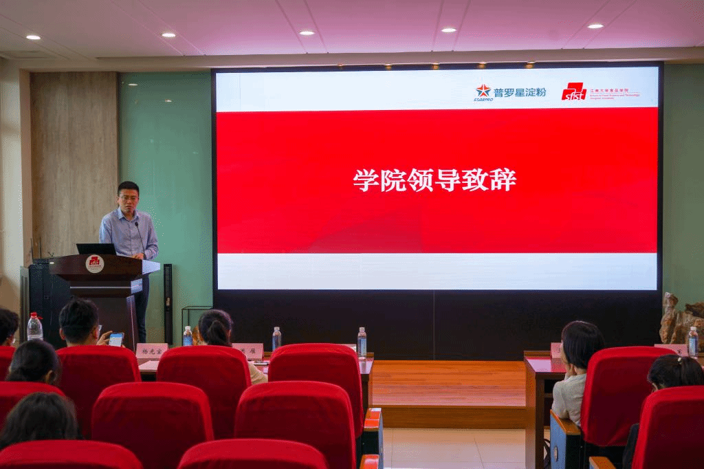 答辩会结束后,宣讲会正式举行。魏珍吉代表食品学院致辞,他对普罗星淀粉有限公司为我校提供奖学金和举办创意大赛表示衷心感谢,他表示,要让学校的人才培养目标与企业的人才需求相互贯通,通过企业进入学校,学校为企业和学生提供平台与载体,让同学们更大程度的了解企业文化,不断提升实践创新能力。