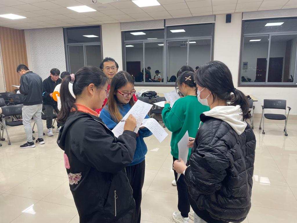 第一个环节是热身活动"桃花朵朵开",同学们按照主持人报出的开花朵数快速抱成团,游戏热身结束后,大家积极分享了该环节的参与体验。随后活动进入“动物进化论”环节,心理委员同学们在活动中共有“鸡蛋”“小鸡”“大鸡”三种形态,分别对应全蹲,半蹲,站立的姿势,如果猜拳胜利,则“成长”;如果猜拳失败,则“退化”。同学们参与热情高涨,活动氛围也被推向高潮。接下来的环节是寻人信息卡,胡晓丹为现场同学分发卡片,上面写有各种代表个人特征的词语,同学们先找到符合本人的特征,再寻找具有相同特征的同学并让对方签下名字,在活动中加深了对彼此的印象。在所有同学结束签名后,大家一起讨论获得签名多或少的原因,个别参与者还积极踊跃地分享了在活动环节中的感受。下一个环节是“信任行走”,两人一组分别扮演“盲人”和“哑巴”的角色,“哑巴”在不能说话的前提下帮助“盲人”同学顺利通过路障。这个环节增强了团队内成员间的信任和团队合作能力。最后一个环节是互写赠言,每位同学将自己想对在场同学说的话写在便签纸上,并送给相应同学,参与者的情感在寄语中迅速升温。活动结束前,胡晓丹引导现场同学用一个词总结自己在此次团辅中的感受,并希望各位心理保健委员同学能将个人体会和感悟应用到所在班级,引导新同学们积极开展心理健康教育活动。